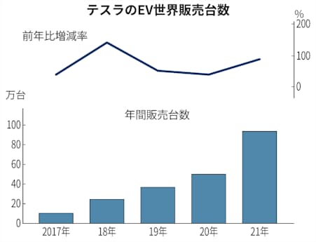 米テスラが2日発表した2021年の電気自動車(EV)の年間販売台数は20年比87%増の93万6172台と過去最高を更新した。世界的な半導体不足でライバルが減産や操業の一時停止を余儀なくされるなか、テスラは代替品への置き換えなどによって高い水準の稼働率を維持。前年比5割増の75万台超としていた当初の販売目標を大きく上回った。