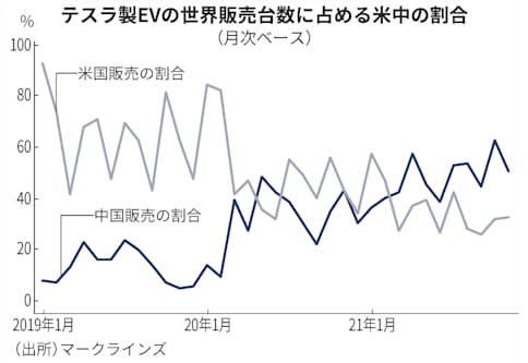 21年の成長をけん引したのは中国事業だ。テスラは地域別の販売台数を開示していないが、調査会社マークラインズによると21年1~11月のテスラの販売台数全体に占める中国販売の割合は47%となり、33%に低下した米国を逆転した。